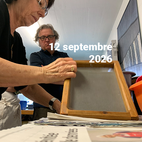 Fabrication de feuilles artisanales et recyclées spéciales gravure et typographie : préparation des pâtes (papiers recyclés), encollage végétal et kaolin pour des surfaces plus lisses et régulières que le papier créatif de l’initiation (et en plus grand format). Formation, pressage, séchage, finitions. Vous repartez avec des échantillons et des feuilles prêtes à imprimer.